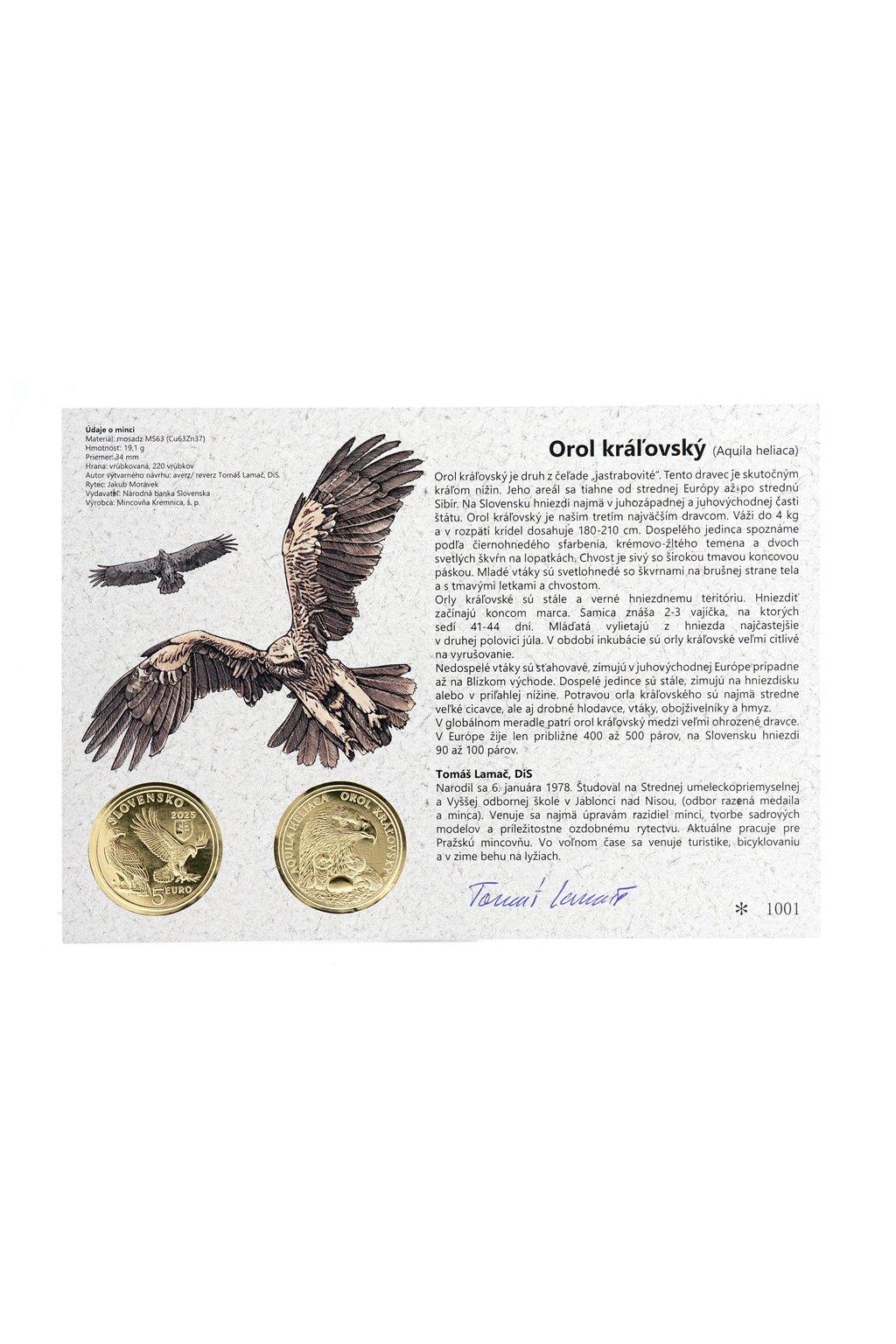 Autorská karta k minci 5 € – Orol kráľovský (2025) je výnimočný zberateľský doplnok, ktorý spája precízne grafické spracovanie s príbehom jedného z najvzácnejších dravcov našej prírody. Karta približuje pozadie vzniku dizajnu mince, obsahuje technické údaje, opis samotného orla kráľovského a predstavuje autora návrhu – výtvarníka Tomáša Lamača, DiS., ktorého vlastnoručný podpis dopĺňa celkový dojem.