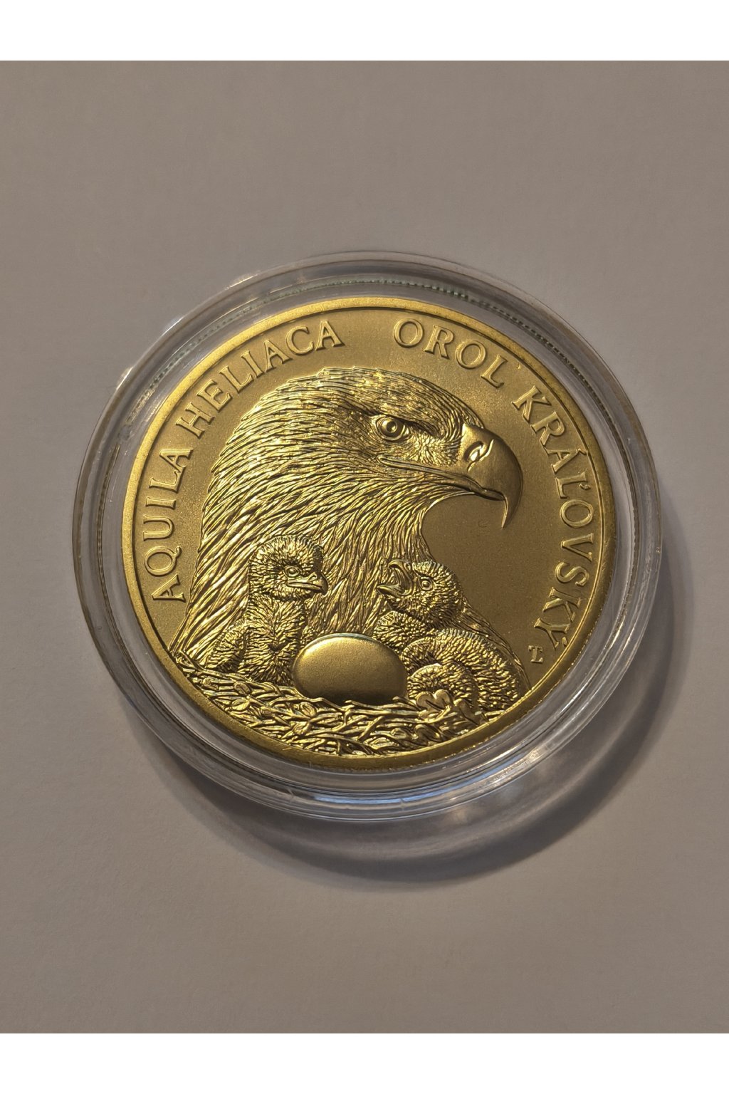 Táto pamätná minca je venovaná jednému z najväčších a najvzácnejších dravcov Slovenska – orlovi kráľovskému. Averz zobrazuje sediaceho a letiaceho orla s vyobrazením štátneho znaku Slovenskej republiky a rokom vydania 2025. Na reverze dominuje detailná hlava dospelého jedinca so scénou v hniezde – dvoma mláďatami a vajcom.