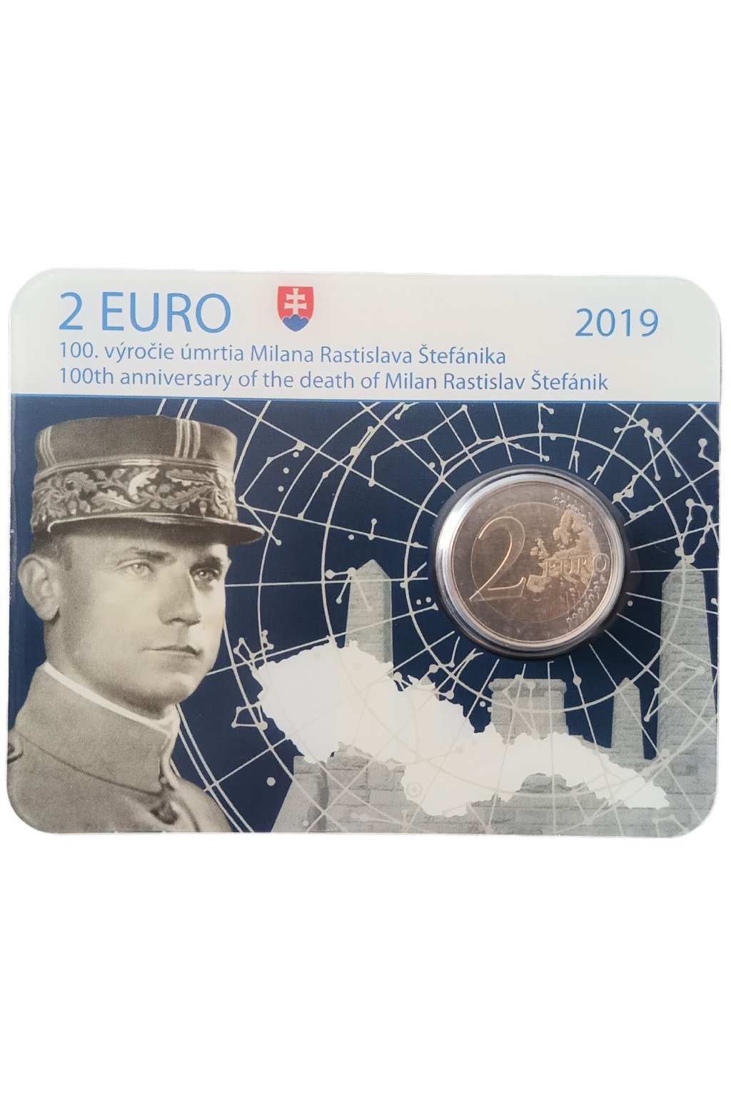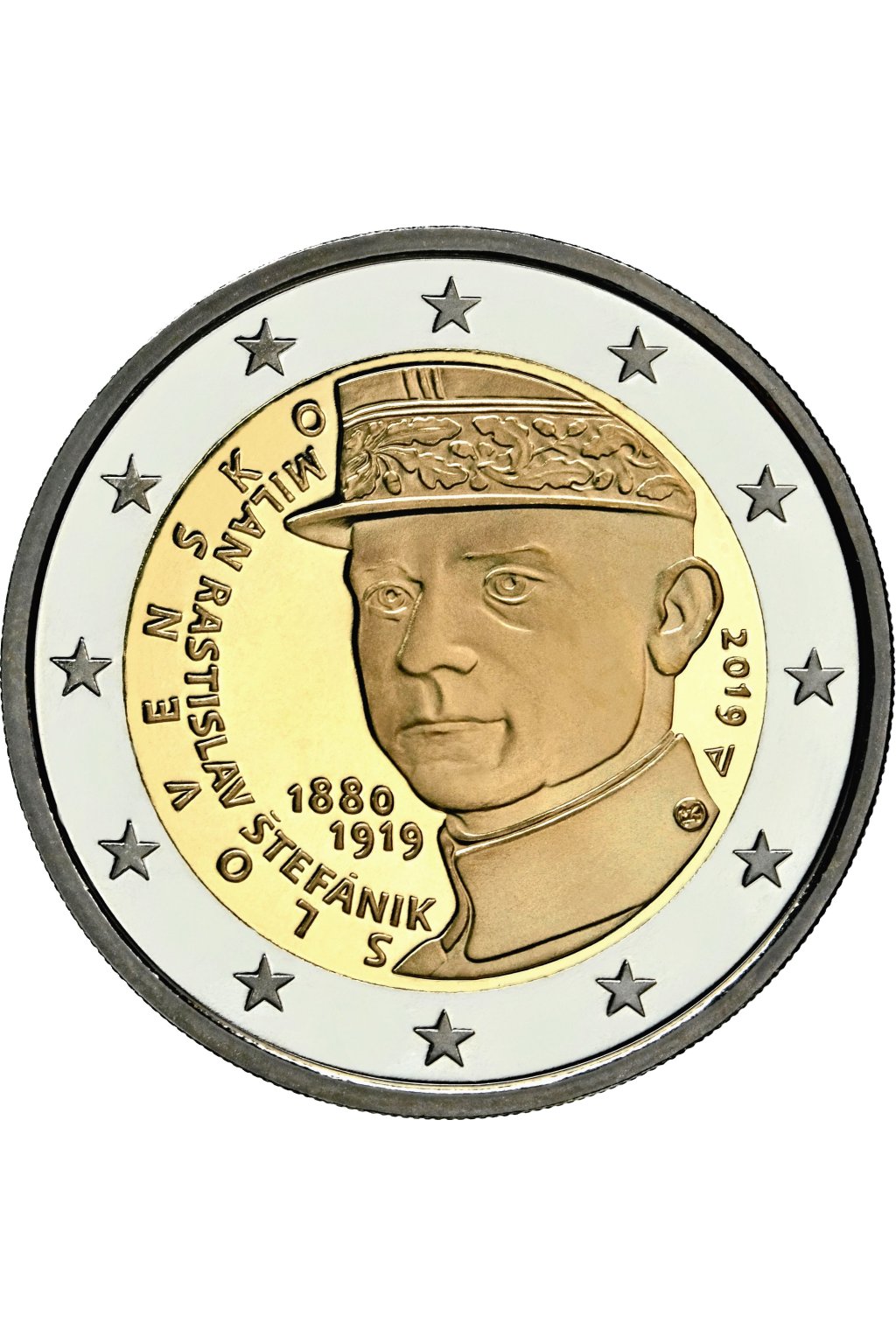 Na minci je vyobrazený portrét M. R. Štefánika s dátumami 1880–1919 a charakteristickou čiapkou generála. Nechýba označenie krajiny vydania SLOVENSKO a rok emisie 2019.