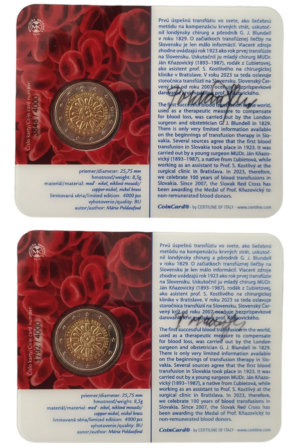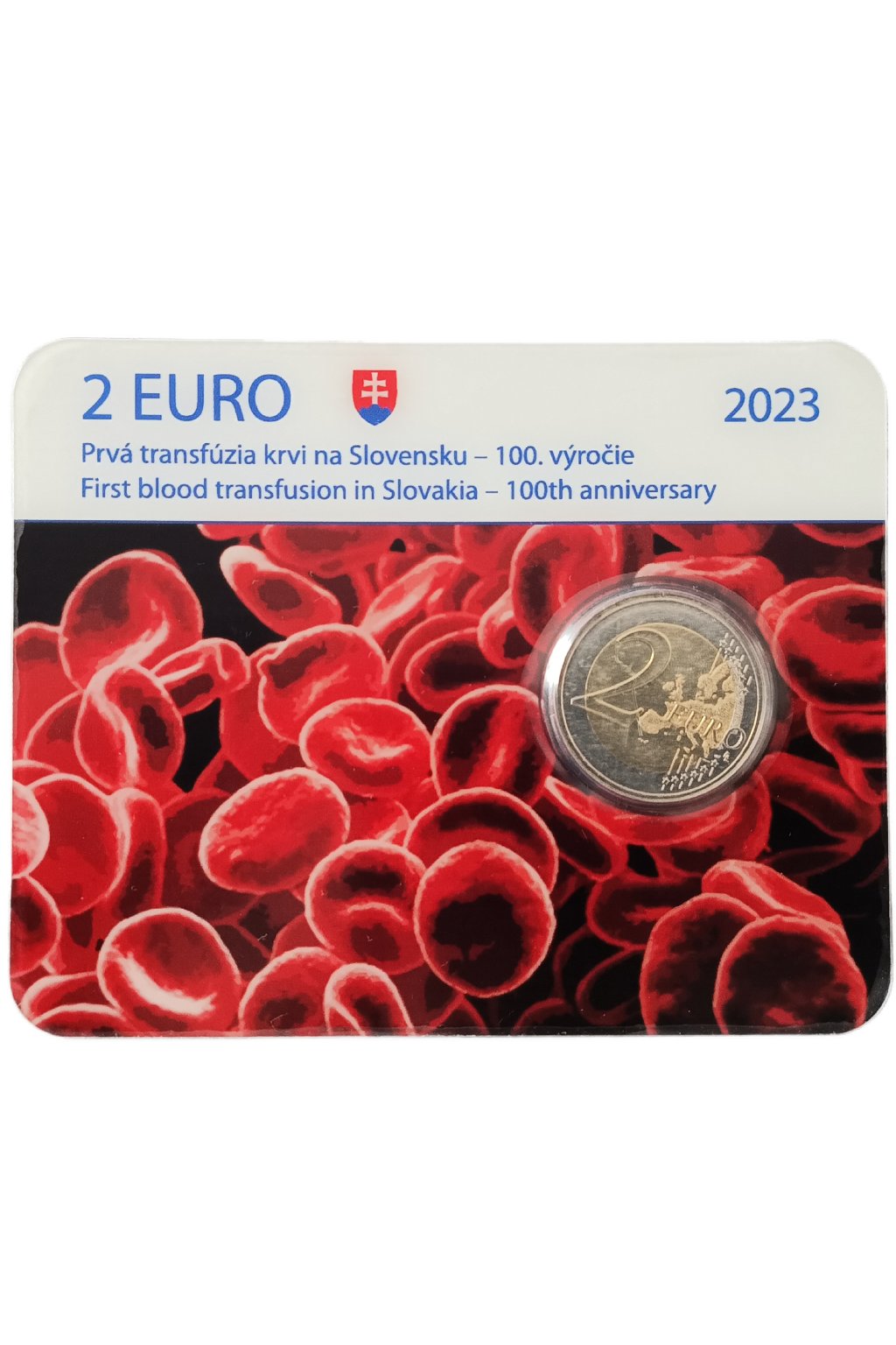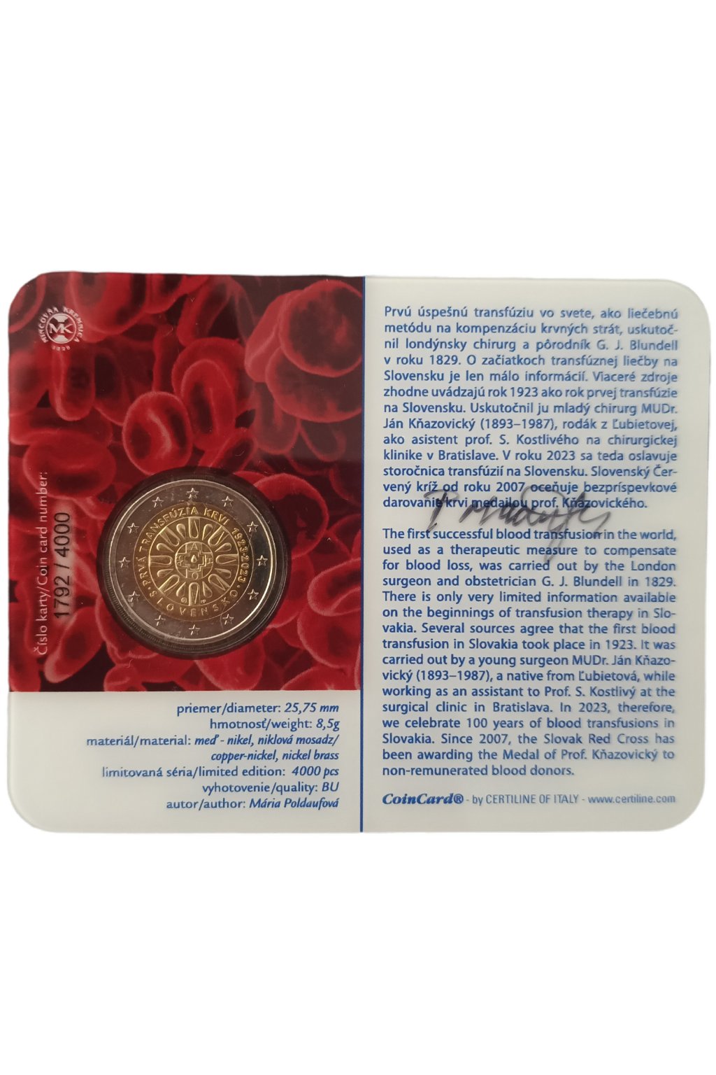 Táto pamätná minca bola vydaná pri príležitosti 100. výročia prvej úspešnej transfúzie krvi na území Slovenska, ktorú vykonal v roku 1923 chirurg MUDr. Ján Kňazovický na klinike v Bratislave.
