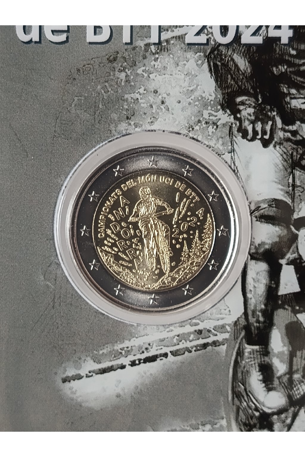 Pamätná 2€ minca Andorry vydaná v roku 2024 oslavuje významné športové podujatie – Majstrovstvá sveta UCI v horskej cyklistike, ktoré sa konali v tejto malebnej krajine ukrytej v Pyrenejach.