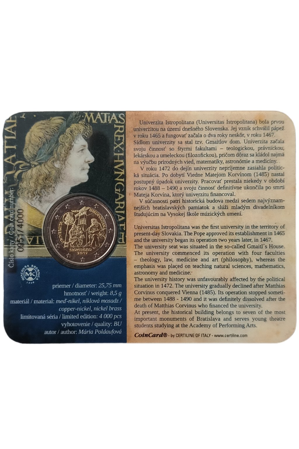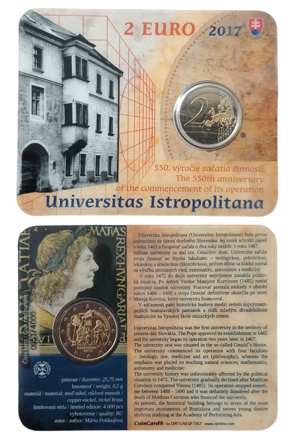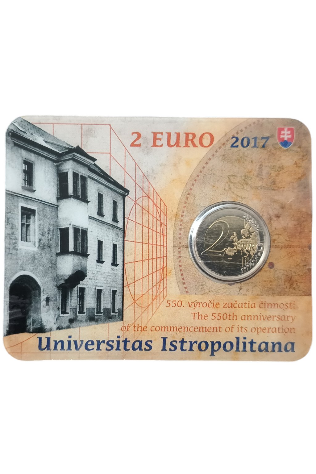 Slovenská 2€ pamätná minca 2017 – Univerzita Istropolitana (zberateľská BU karta)