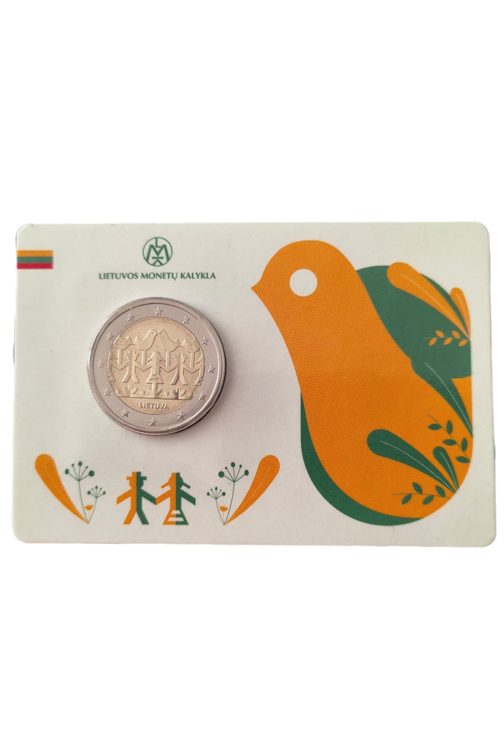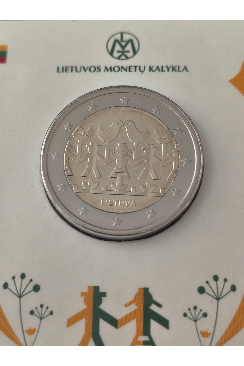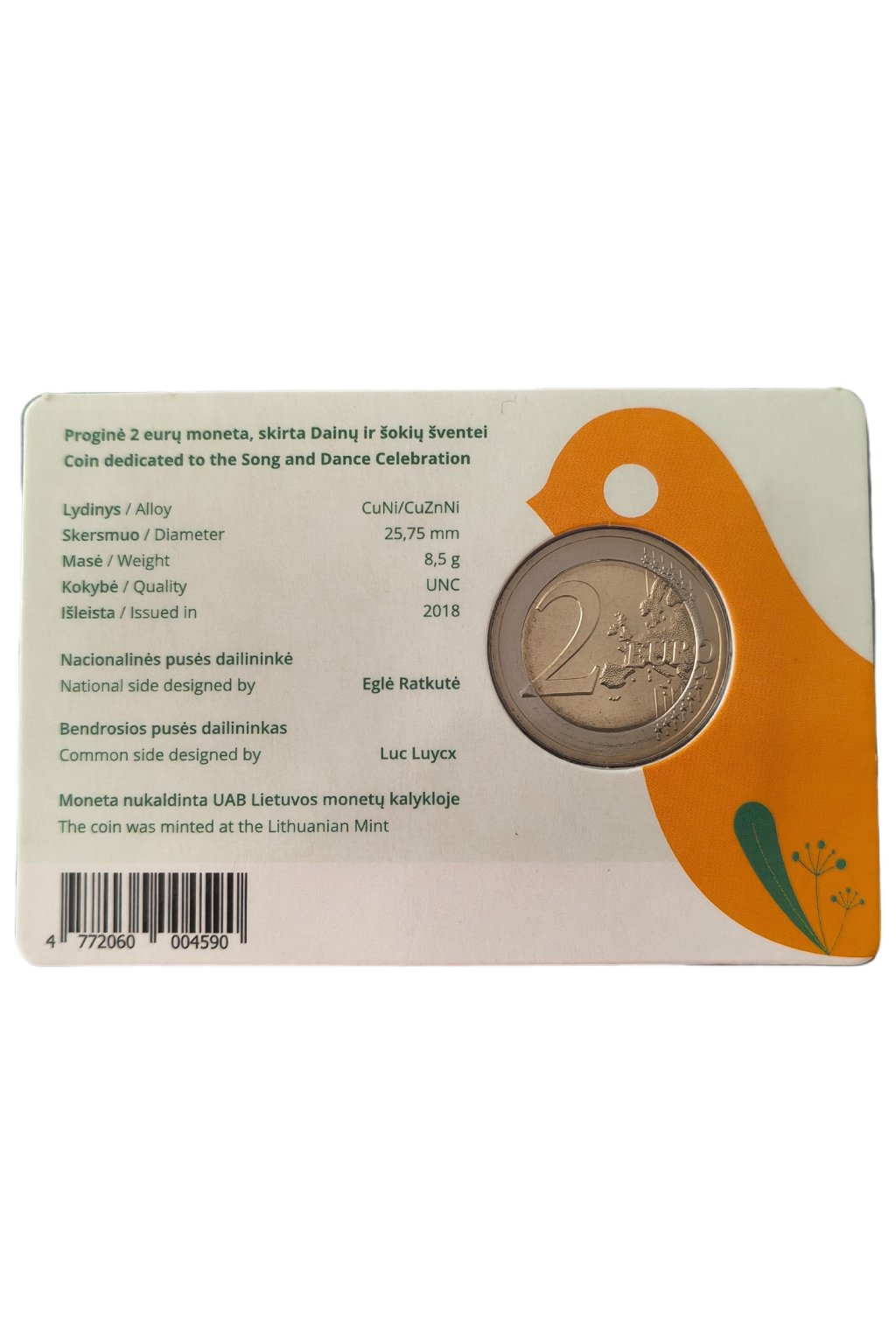 Na minci dominuje motív ľudí držiacich sa za ruky v tradičných vzoroch, symbolizujúcich jednotu, spolupatričnosť a živú kultúrnu tradíciu Litvy. Vyrazená je v zberateľskej kvalite briliant uncirculated a uložená v originálnej zberateľskej karte vydanej Litovskou mincovňou (Lietuvos Monetų Kalykla). Farebné a hravé grafické spracovanie karty korešponduje s ľudovým charakterom podujatia a dotvára príjemnú atmosféru celého produktu.