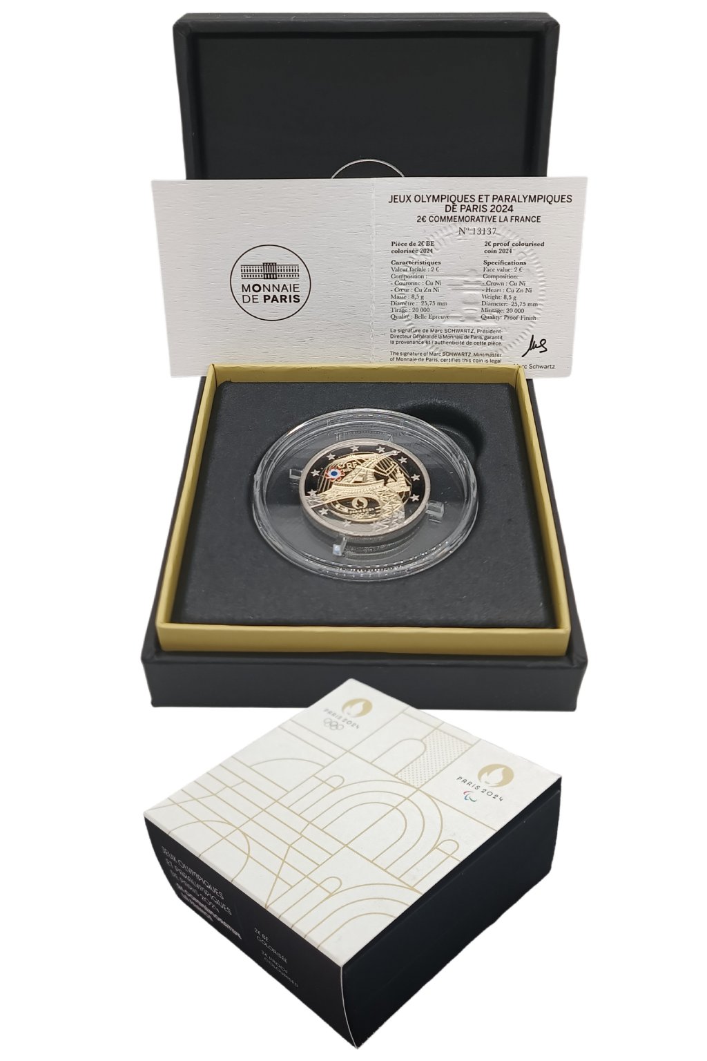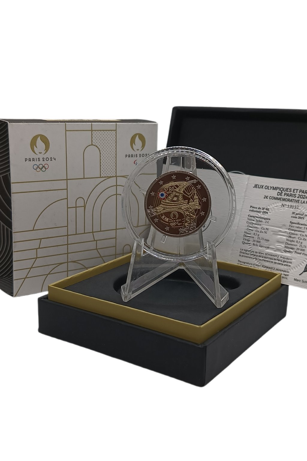 Pri príležitosti blížiacich sa Letných olympijských hier Paríž 2024 vydala Monnaie de Paris výnimočnú 2€ pamätnú mincu v limitovanej farebnej verzii proof kvality, ktorá osloví každého zberateľa špičkových numizmatických kúskov. Táto edícia predstavuje unikátne spojenie tradičného razenia s moderným farebným prvkom, vďaka čomu patrí medzi najexkluzívnejšie olympijské mince súčasnosti.