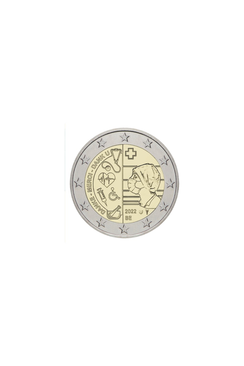 Pamätná minca vydaná Belgickom v roku 2022 vzdáva úctu a vďaku všetkým zdravotníkom za ich nasadenie počas pandémie COVID-19. Minca nesie nápisy „DANKE – MERCI – DANK U“, čím vyjadruje vďačnosť v troch oficiálnych jazykoch krajiny. Grafický motív kombinuje portrét zdravotníčky s rúškom a symboly zdravotníctva, ako napríklad stetoskop, injekčnú striekačku či EKG krivku – čím vizuálne zobrazuje hrdinstvo a starostlivosť v najťažších časoch.