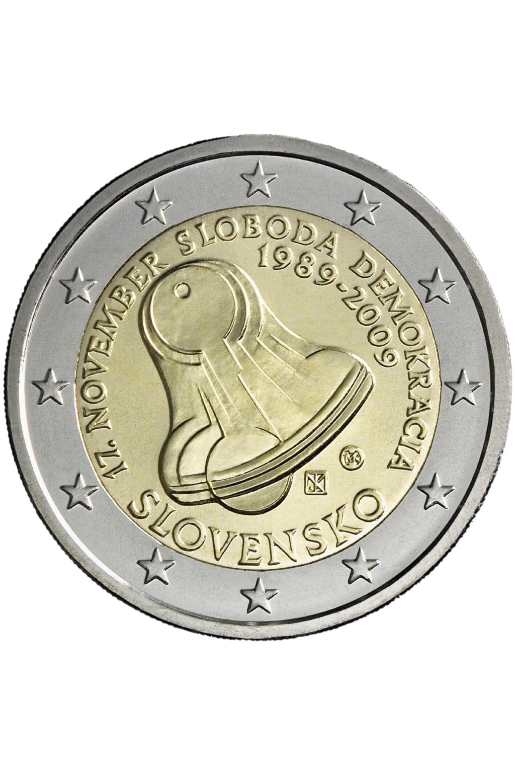 Prvá slovenská 2€ pamätná minca bola vydaná v roku 2009 pri príležitosti 20. výročia Nežnej revolúcie, ktorá znamenala pád totalitného režimu a nástup slobody a demokracie.