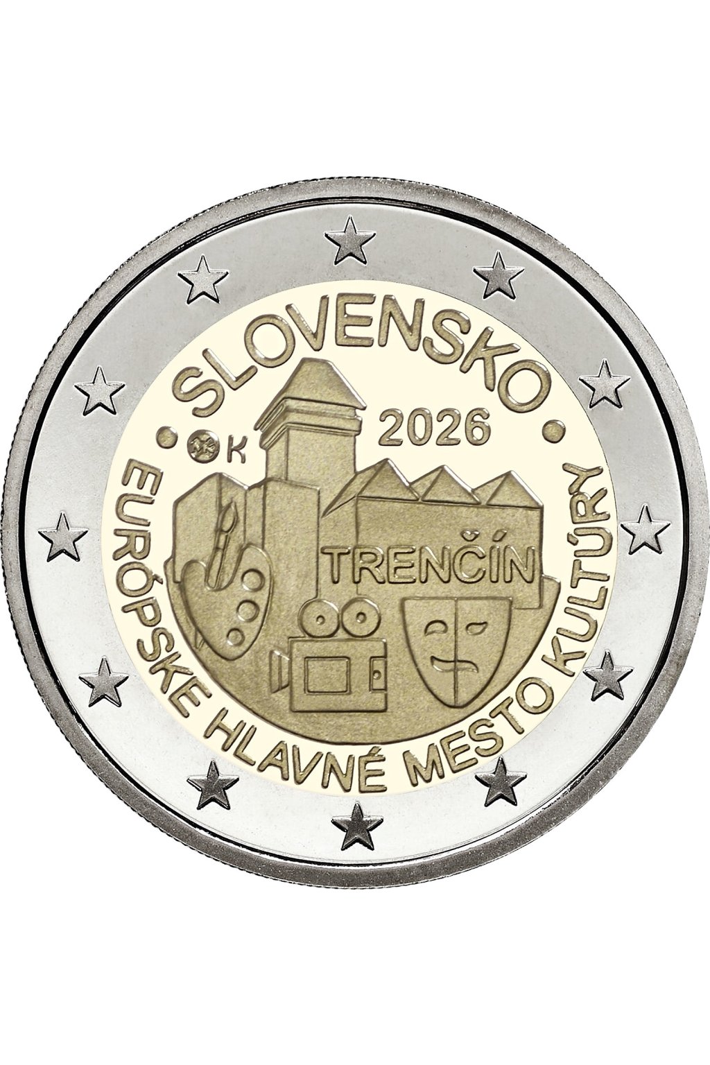 Pamätná 2-eurová minca Slovenskej republiky z roku 2026 pripomína mesto Trenčín, ktoré sa v tomto roku stalo Európskym hlavným mestom kultúry. Toto významné ocenenie poukazuje na výnimočné postavenie Trenčína v oblasti kultúry, umenia a kreatívneho priemyslu, ako aj na jeho bohaté historické dedičstvo a aktívny kultúrny život.